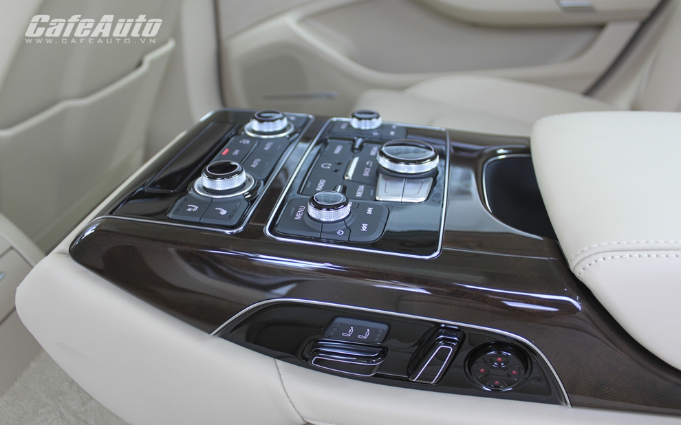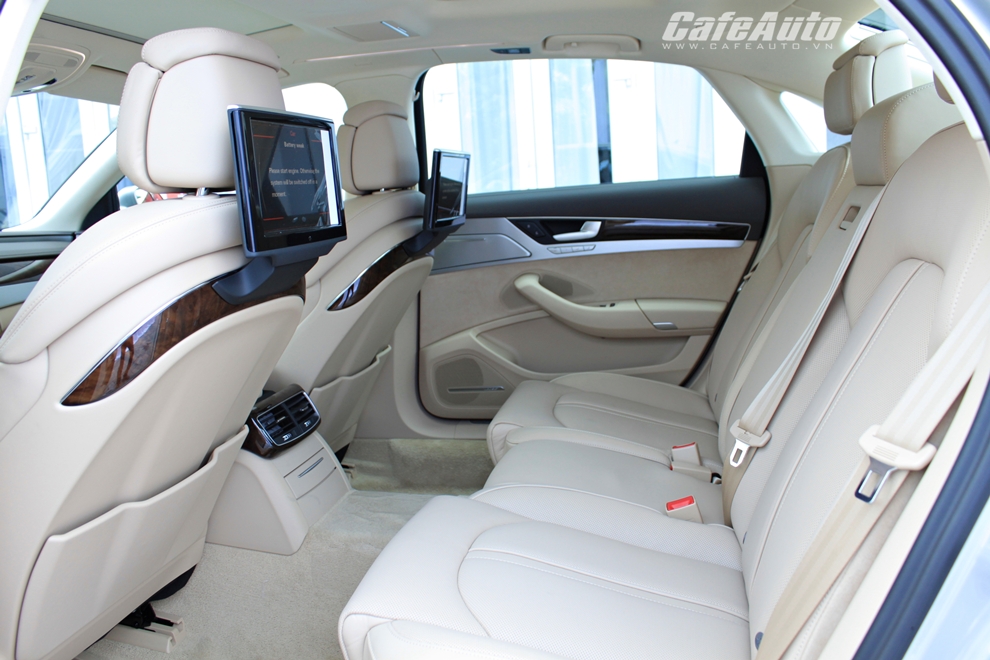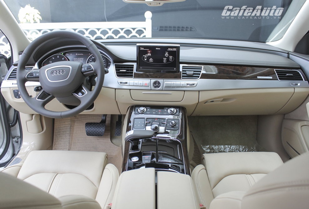 Về nội thất, Audi A8L 2014 được thiết kế theo phong cách sang trọng, lịch lãm và hướng đến sự rộng rãi tối ưu. Từng chi tiết bên trong xe đều được chế tác từ những chất liệu cao cấp được chọn lựa và hoàn thiện một cách tỉ mỉ. Audi cũng cung cấp nhiều tùy chọn cho hai ghế trước điều chỉnh điện, bao gồm các chức năng thông gió và 5 chế độ mát-xa. Cụm điều khiển trung tâm bọc da và tùy chọn gác chân điều khiển điện cho hàng ghế sau, màn hình giải trí cho hàng ghế sau, hệ thống điều hòa tự động tích hợp chế độ lọc khí ion, cửa hít và tủ lạnh trên xe.
