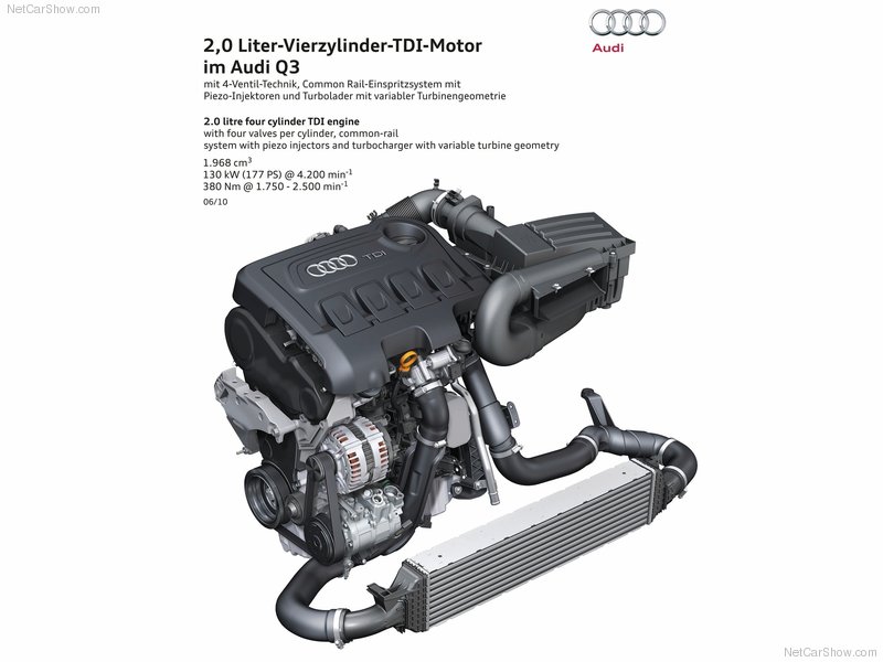 Động cơ diesel 2.0 TDI có công suất 140 mã lực và mô-men xoắn 230Nm. Đây là phiên bản “yếu” nhất của Q3 khi tăng tốc từ 0 lên 100 km/h mất 9.9s và chỉ đạt tốc độ 202 km/h. Audi công bố có mức tiêu thụ nhiên liệu của động cơ này là 5.2 lít/100km. Tất cả các phiên bản của Q3 điều được cung cấp hệ thống dẫn động bốn bánh Quattro và 4 chế độ vận hành tùy theo điều kiện thực tế.