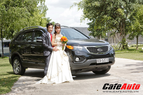 Đôi uyên ương trẻ đang chụp hình cưới cứ nhất định đề nghị được chụp vài tấm kỷ niệm với New Sorento.