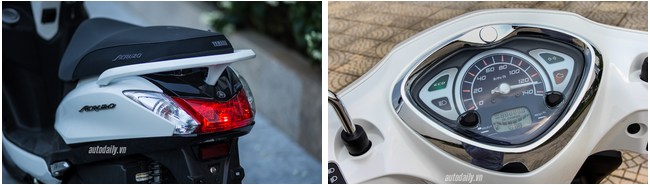Tiến về phía sau, Acruzo mang lại cho bạn cảm giác hoàn toàn khác. Yên xe thiết kế mới khá rộng và êm. Thanh nắm dắt phía sau được làm bản to tạo cảm giác rất chắc chắn. Dòng chữ Yamaha ở phía sau và Acruzo ở 2 bên yên xe được may nổi tinh tế vào ấn tượng giống như trên Grande. Phần đuôi xe được thiết kế bo tròn chia làm 3 vùng rõ rệt bao gồm đèn báo phanh và xi-nhan.